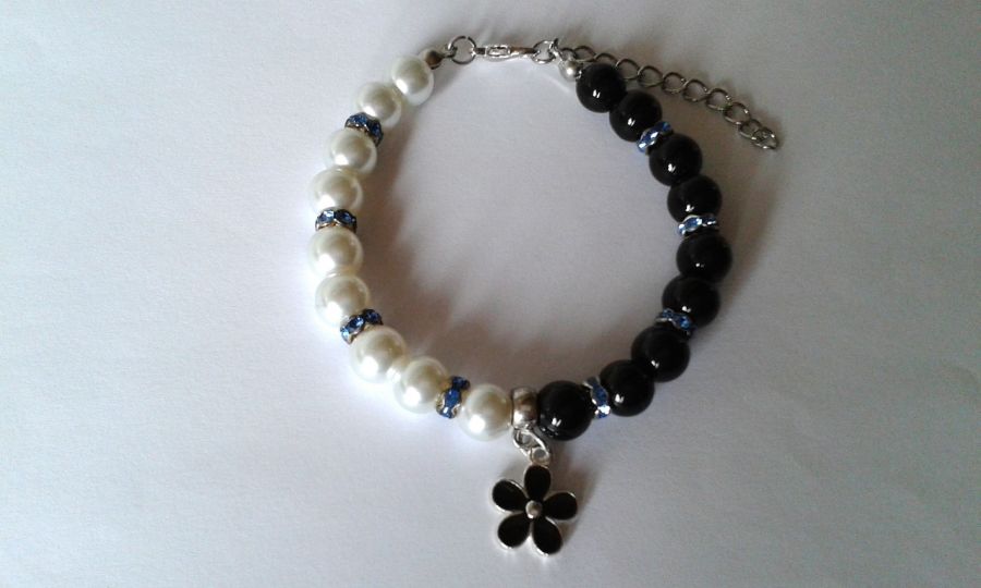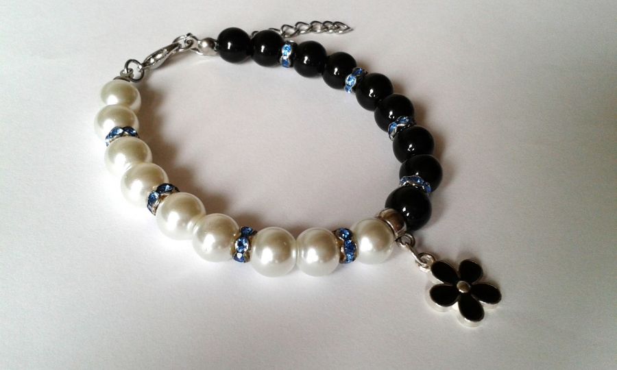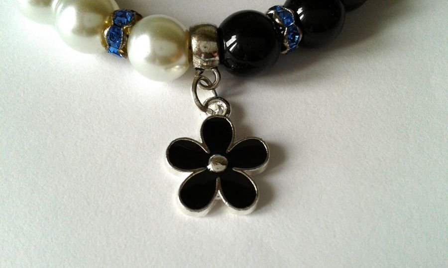 Piękna, wykonana ze szklanych pereł (czarnych i białych) bransoletka, urozmaicona cyrkoniowymi, niebieskimi przekładkami, z zawieszką w kształcie kwiatka.