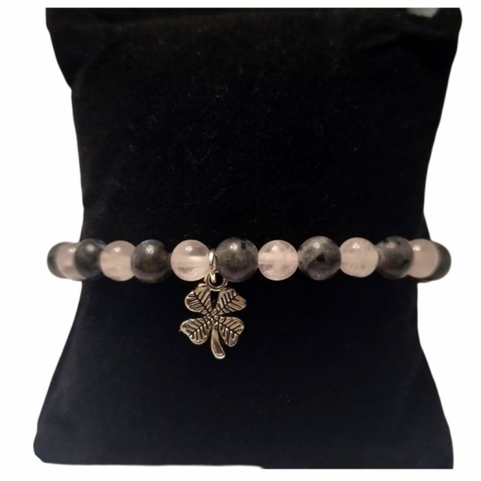 Bransoletka na gumce wykonana z kulek kamieni labradorytu i różowego kwarcu w rozmiarze 6mm, Każdy kamyczek labradorytu to odcienie szarości zaś różowy kwarc to kamyczki jasne z bardzo delikatnym odcieniem koloru różowego. Bransoletka została ozdobiona zawieszką w kształcie czterolistnej koniczyny.