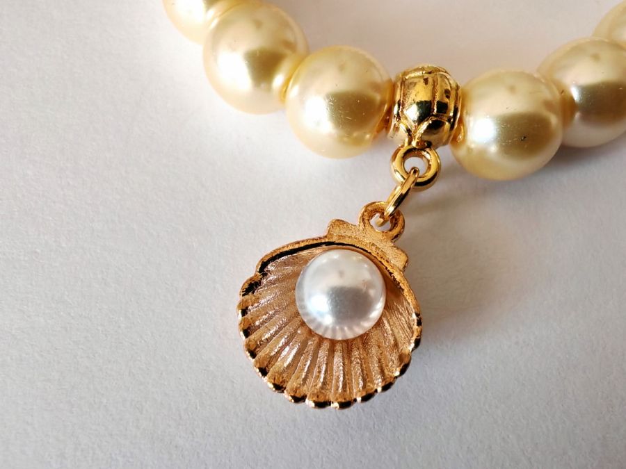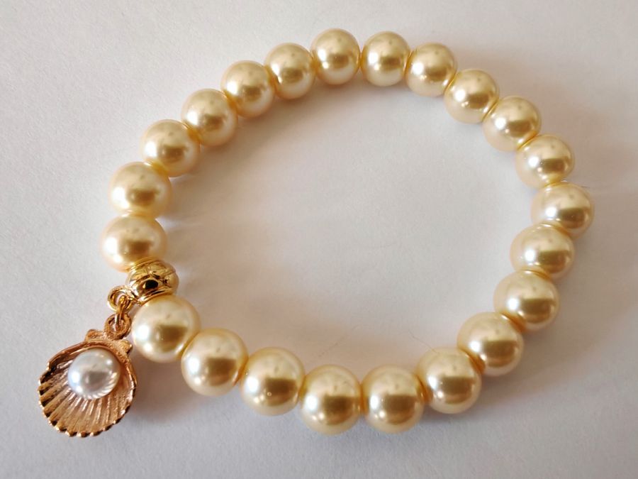Bransoletka ze szklanych pereł w kolorze ecru w rozmiarze 8 mm, ozdobiona śliczną zawieszką - złotą muszelką z perłą.