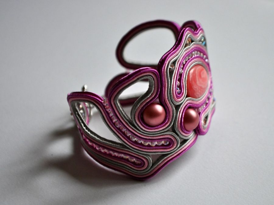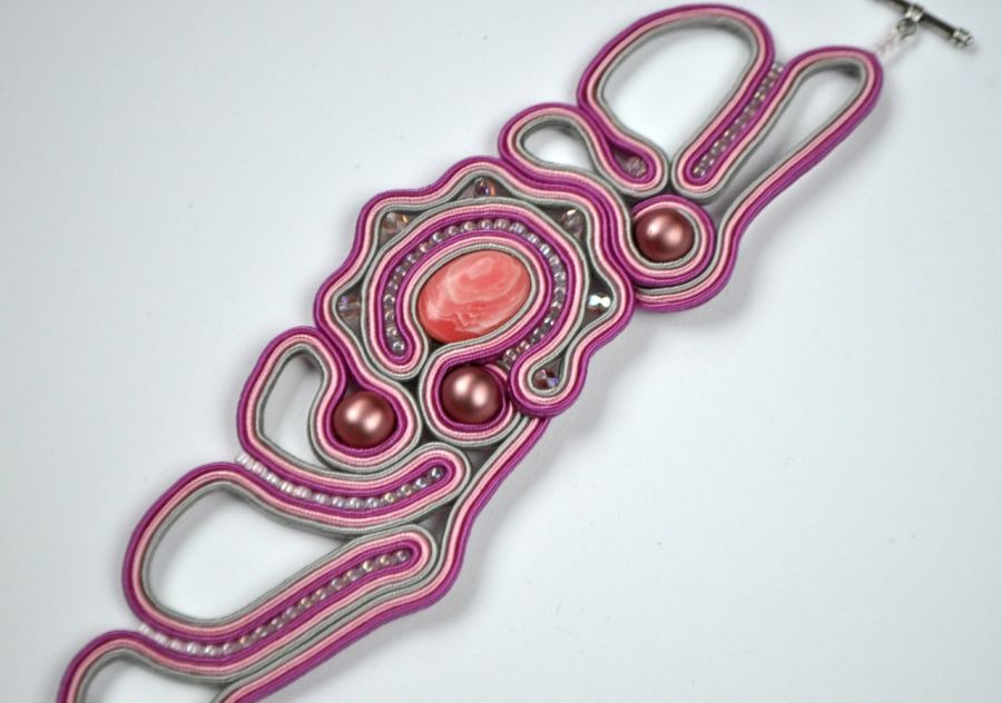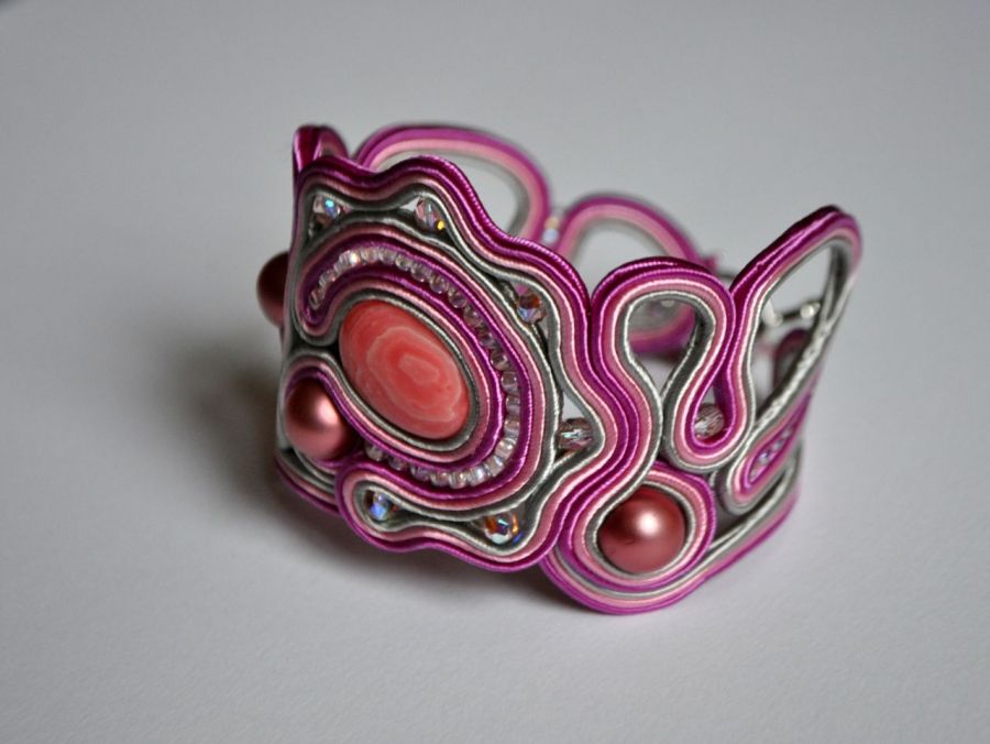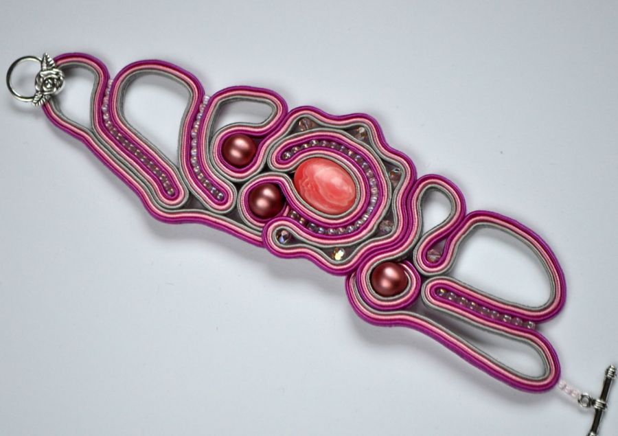 Bransoletka jest wykonana ze sznurków sutasz w odcieniach różu i szarości. W centrum znajduje się pastylka różowego kamienia. Do wykonania bransoletki użyłam szklanych koralików Toho i Fire polish wysokiej jakości oraz szklanych pereł. Starannie, w niewielkim stopniu wykończona pod spodem szarym filcem. Bransoletka posiada wygodne metalowe zapięcie toggle. Bardzo dobrze układa się na ręce. Pasuje na nadgarstek max 18 cm, szerokość ok. 5 cm. Oryginalna, ciekawy wzór z prześwitami, pięknie się prezentuje. Polecam.
