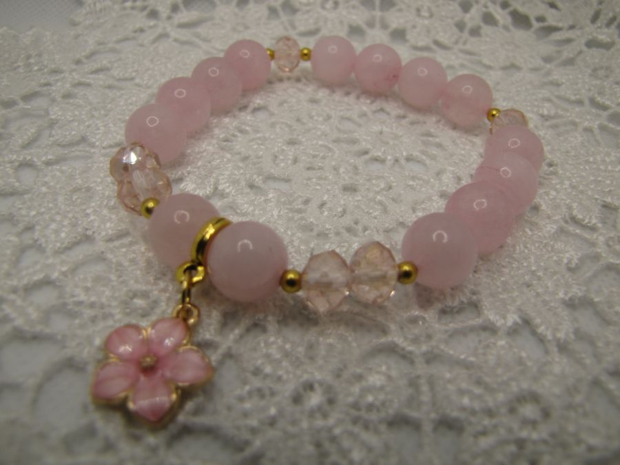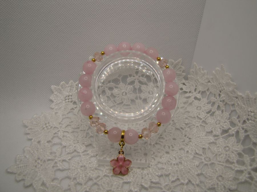Bransoletka z różowego kwarcu - kule 10mm, na wytrzymałej gumce. Uzupełnione kryształkami i metalowymi przekładkami w kolorze złotym. Całości dopełnia urocza zawieszka emaliowany różowy kwiatek. Bransoletka pasuje na nadgarstek 17-18cm obwodu.