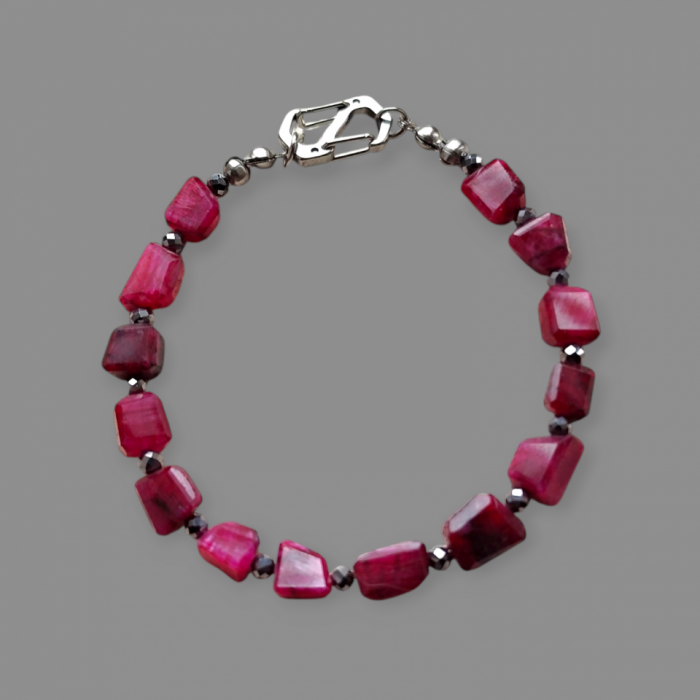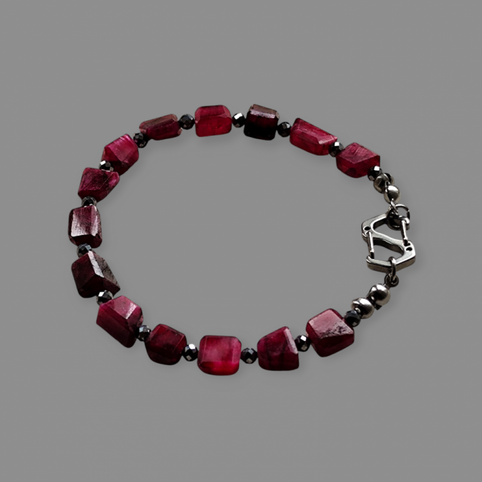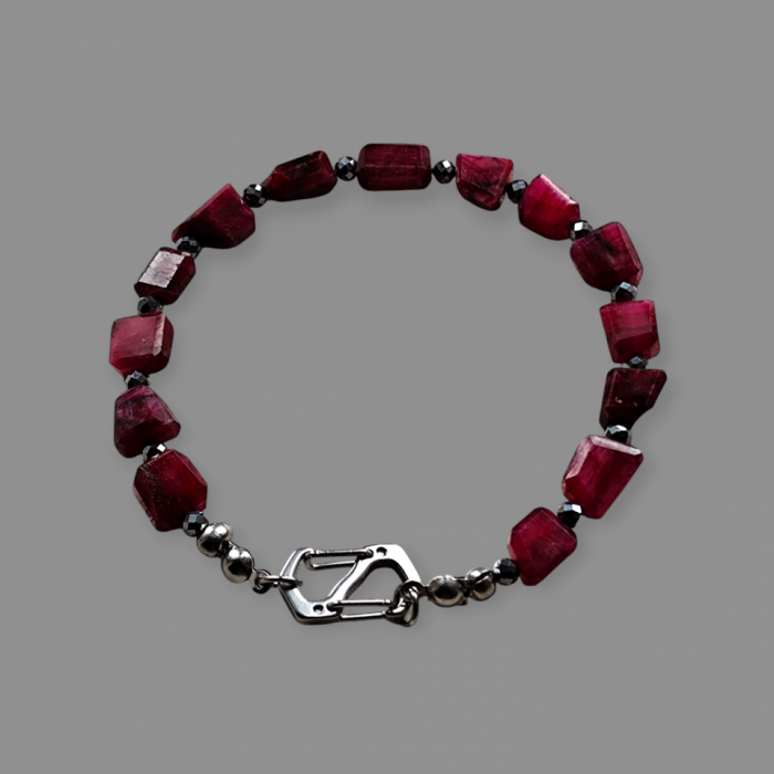 Przedstawiam unikatową bransoletkę wykonaną z naturalnych, surowych rubinów o nieregularnych kształtach, które zachwycają swoją autentycznością i głęboką barwą. Pomiędzy rubinami umieściłam drobne paciorki terahercu, które swoim grafitowym połyskiem podkreślają szlachetność głównych kamieni. Całość została nawleczona na niezwykle wytrzymałą linkę jubilerską i zwieńczona solidnym, nowoczesnym zapięciem z tytanu.