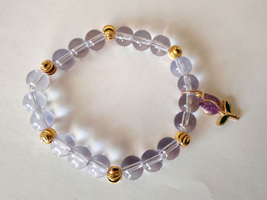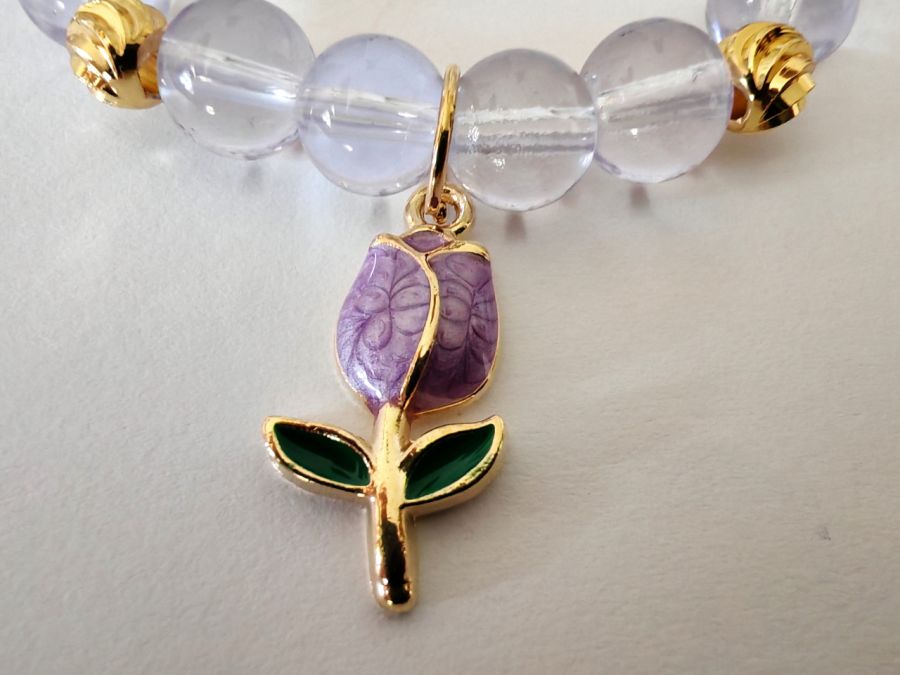 Bransoletka ze szklanych, transparentnych koralików Perfect (rozmiar 8 mm) w pięknym, bardzo delikatnym fioletowym odcieniu. Ozdobiona złotymi kuleczkami oraz zawieszką w kształcie tulipana.