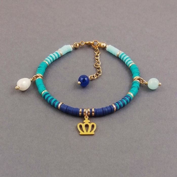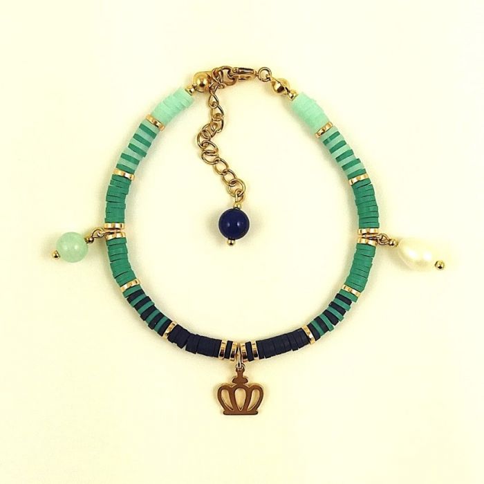 Bardzo dekoracyjna bransoletka z krążków katsuki (koraliki polimerowe) w pięknych kolorach zieleni i granatu oraz krążków złotego hematytu. Kamienie mają średnicę 4mm. Zawieszki to; gładka kulka seledynowego jadeitu (6mm), perła hodowlana i korona z pozłacanej stali szlachetnej. Przy łańcuszku kulka granatowego jadeitu.