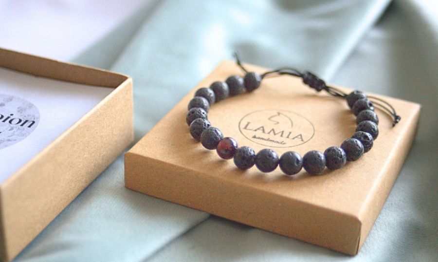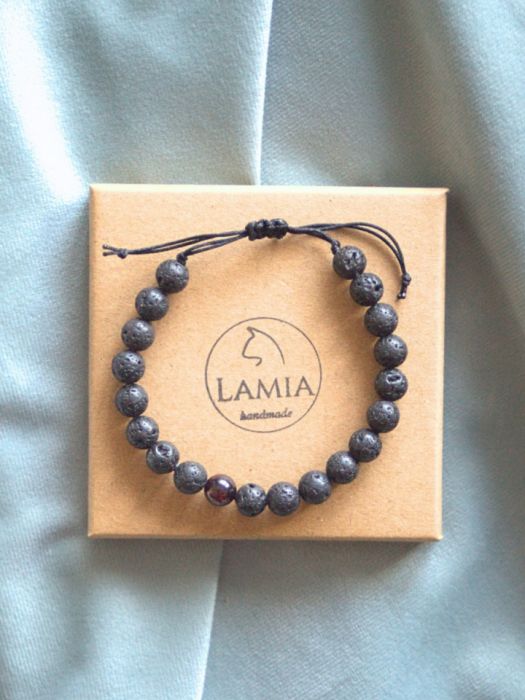 Bransoletka wykonana jest na podwójnym sznurku nylonowym w kolorze czarnym o grubości 1,5mm każdy. Na sznurku nawleczone są kamienie naturalne - granat oraz lawa wulkaniczna. Bransoletka jest regulowana, zapięcie to wiązanie makramowe.