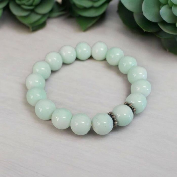 Koraliki szklane, w rozmiarach 12mm. Elementy metalowe, posrebrzane, antyalergiczne.