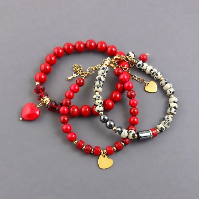 Dwie bransoletki w kolorze energetycznej, ciemnej czerwieni. Pierwsza z nich, na wygodnej gumce z gładkich kulek marmurkowych i oponek czerwonych kryształków z zawieszką sercem z marmuru. Kamienie mają średnicę 8mm, a serce 13mm.