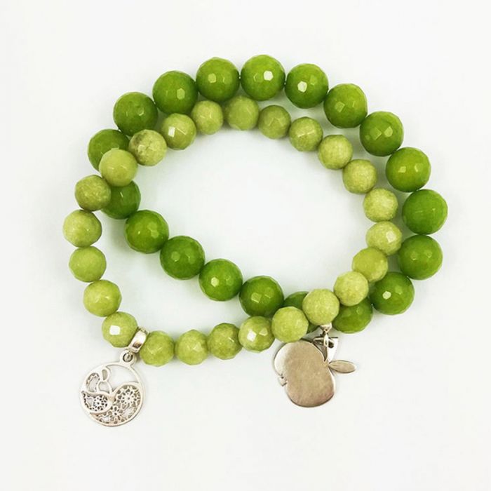 Dwie bransoletki na wygodnych, elastycznych gumkach z naturalnych kamieni, ze srebrnymi zawieszkami. Pierwsza, ciemniejsza to fasetowane kule jadeitu o średnicy 10 mm, o pięknej głębokiej barwie, ciemnej, oliwkowej zieleni ze srebrną (Ag 925) zawieszką jabłuszkiem. Druga, jaśniejsza, to fasetowane kule jadeitu o średnicy 8 mm i z ażurową, srebrną (Ag 925) zawieszką z roślinnym motywem. Polecam uwadze ze względu na obłędne kolory.