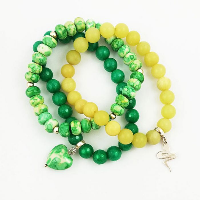Zestaw trzech bransoletek z naturalnych kamieni, na wygodnych gumkach, ze srebrnymi dodatkami (Ag 925).