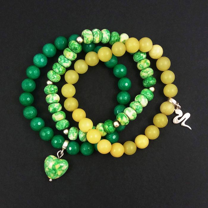 Trzecia to gładkie kulki jadeitu o średnicy 8 mm, o jasno żółto zielonym kolorze z zawieszką wężem.