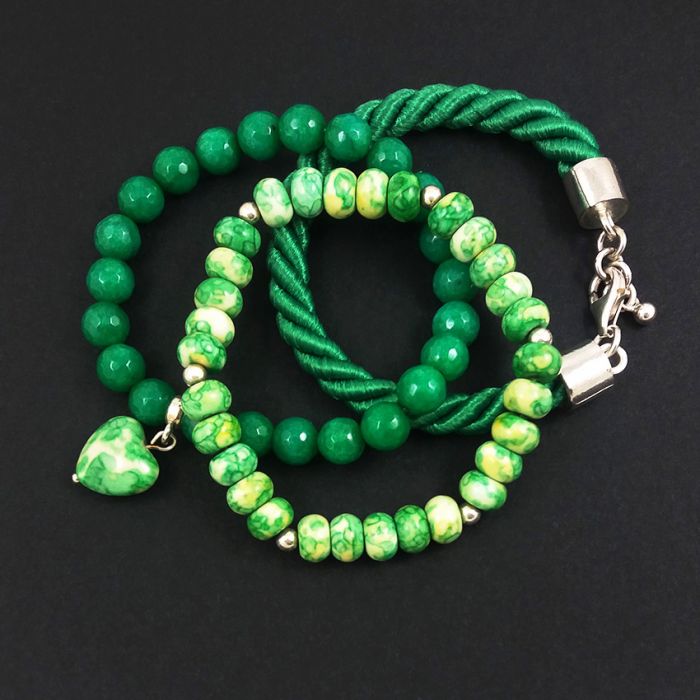 Pierwsza to fasetowane kulki jadeitu o średnicy 8 mm, w intensywnie zielonym kolorze z zawieszką sercem z kwiatowego howlitu.