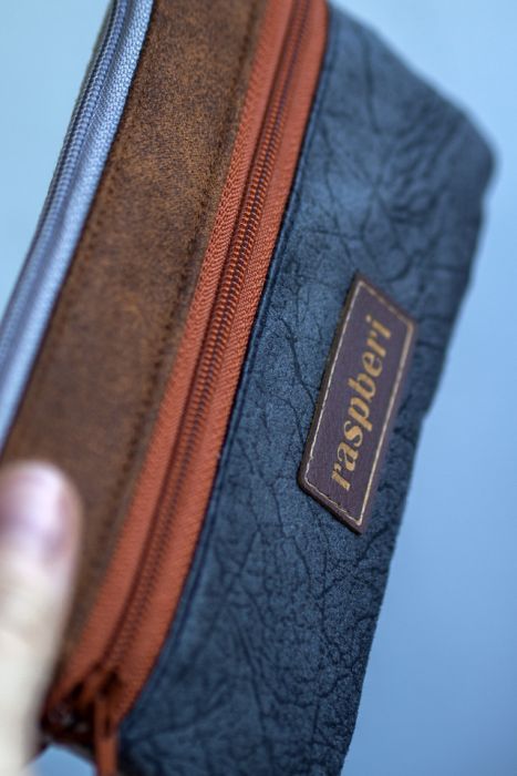 Prosty wodoodporny portfel w kolorze brązowo-szarym.