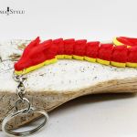 Breloczek do kluczy w kształcie smoka, w dwóch kolorach czerwonym i żółtym, z łańcuszkiem i kółkiem w kolorze srebrnym. Zawieszka jest wydrukowana na drukarce 3D w warunkach domowych z dbałością o każdy szczegół, wyczuwalne są nawet najmniejsze elementy. Breloczek składa się z ruchomych elementów, dzięki czemu jest elastyczny i przyjemny w dotyku. Może również służyć jako zabawka.