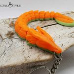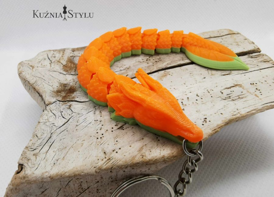 Breloczek do kluczy w kształcie smoka, w dwóch kolorach pomarańczowym i zielonym, z łańcuszkiem i kółkiem w kolorze srebrnym. Zawieszka jest wydrukowana na drukarce 3D w warunkach domowych z dbałością o każdy szczegół, wyczuwalne są nawet najmniejsze elementy. Breloczek składa się z ruchomych elementów, dzięki czemu jest elastyczny i przyjemny w dotyku. Może również służyć jako zabawka.