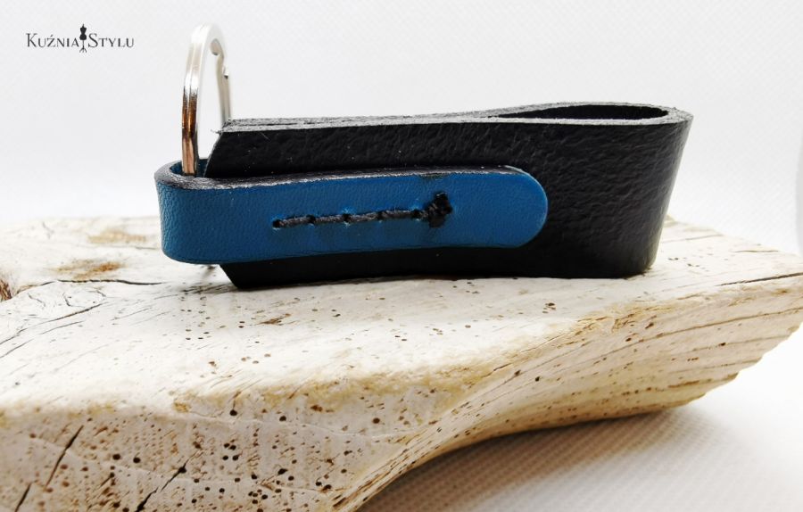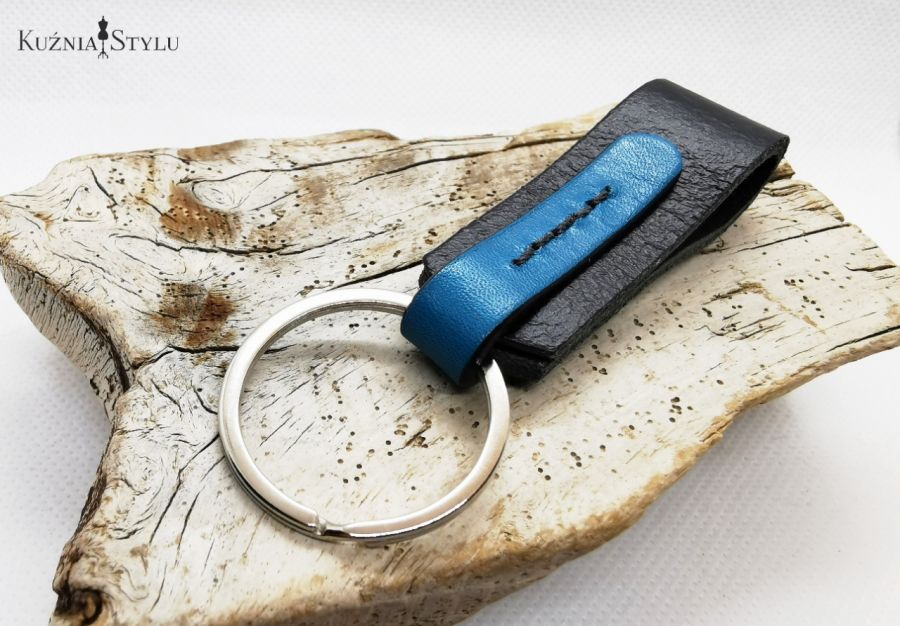 Brelok do kluczy męski, wykonany ze skóry naturalnej w kolorze czarnym z doszytym niebieskim rzemykiem. Wykonany w 100 % handmade bez użycia kleju, rzemyki są ze sobą zszyte.