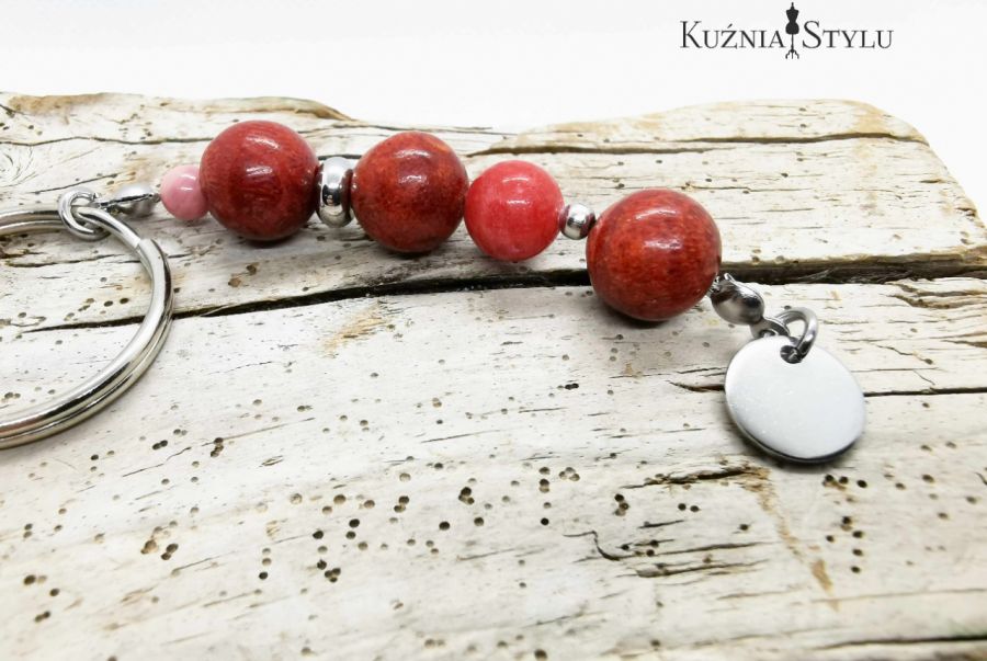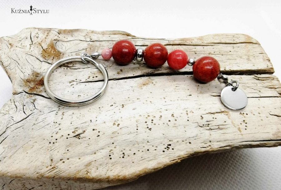 Breloczek czerwony do kluczy z naturalnych kamieni. Wykonany ręcznie. Do breloczka doczepiona jest metalowa blaszka w kolorze srebra ze stali szlachetnej. Breloczek jest wykonanych z kamieni - jadeitu, koralu i rodonitu nawleczonych na stalową linkę.