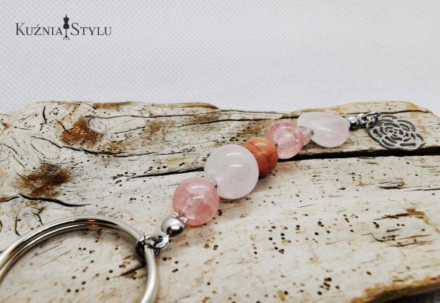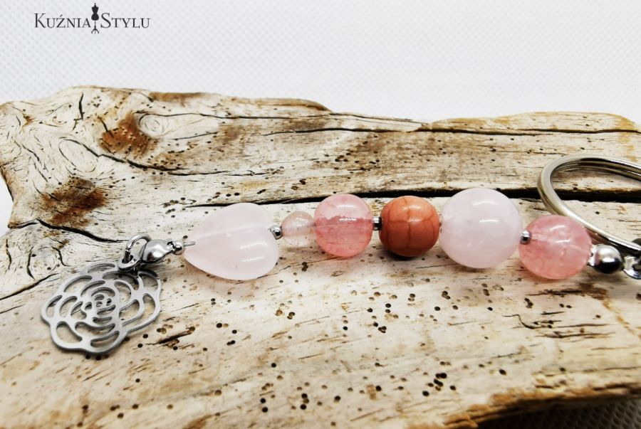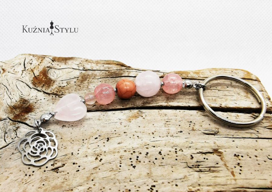 Breloczek różowy do kluczy z naturalnych kamieni z serduszkiem z kwarcu różowego. Wykonany ręcznie. Do breloczka doczepiona jest metalowa zawieszka w kształcie kwiatka w kolorze srebrnym ze stali szlachetnej.