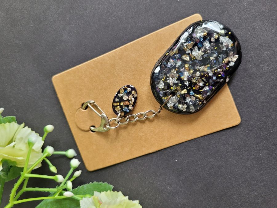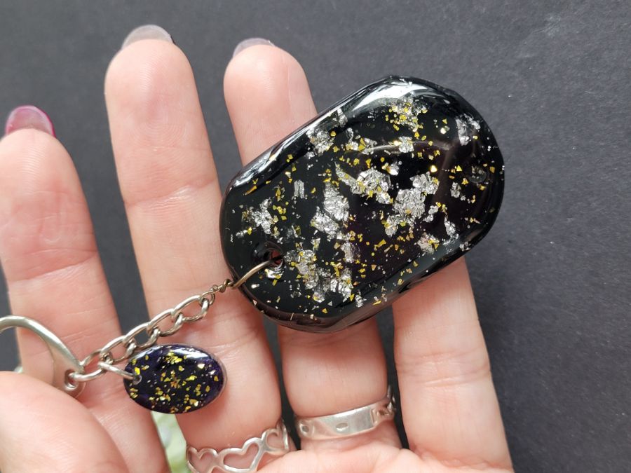 Brelok czarno-srebrny z żywicy to uroczy dodatek do kluczy lub torebki.