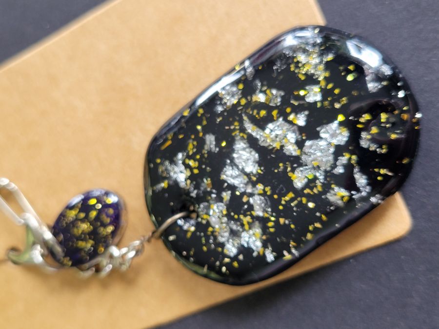 Jego elementy są własnoręcznie zrobione z żywicy epoksydowej z dodaniem brokatów i tłuconego szkła.