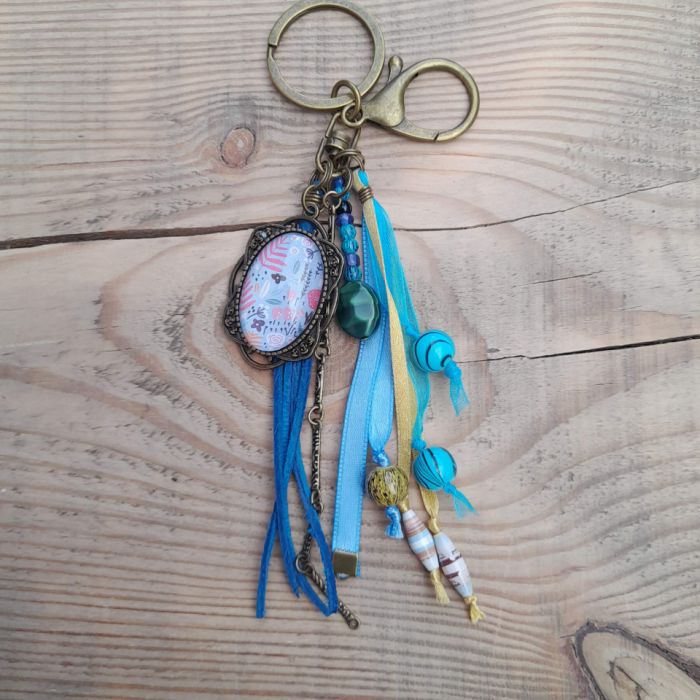 Dodaj odrobinę koloru i wyjątkowego stylu do swoich kluczy lub torebki! Oryginalny, ręcznie wykonany brelok w stylu boho z ozdobną ramką w kolorze starego złota. W ramce znajduje się kolorowy motyw kwiatowy na jasnym tle. Brelok zdobią barwne koraliki w odcieniach zielonego, niebieskiego oraz żółtego, zawieszone na niebieskich tasiemkach. Całość uzupełnia solidne metalowe zapięcie z karabińczykiem i kółkiem na klucze.