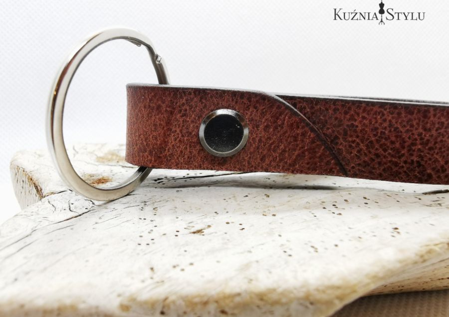 Brelok do kluczy męski, wykonany ze skóry naturalnej w kolorze brązowy z doczepionym metalowym kółkiem. Wykonany w 100 % handmade bez użycia kleju, połączony za pomocą metalowego napa / knopika