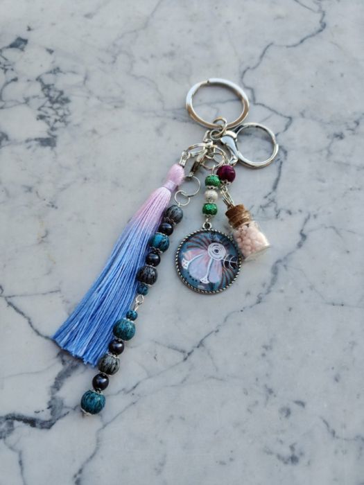 Ręcznie wykonany brelok o artystycznym charakterze, łączący delikatność kwiatowego motywu z wyrazistymi, naturalnymi kolorami. Centralnym elementem jest okrągła zawieszka z motywem kwiatu, uzupełniona dekoracyjną buteleczką z drobnymi koralikami oraz długim, dwukolorowym chwostem w odcieniach błękitu i lawendy. Całość dopełniają ozdobne koraliki w tonacjach niebieskiego, turkusu, grafitu i zieleni, tworząc harmonijną, przyciągającą wzrok kompozycję. Idealny jako stylowy dodatek do kluczy, torebki lub plecaka, a także jako wyjątkowy, rękodzielniczy prezent.
