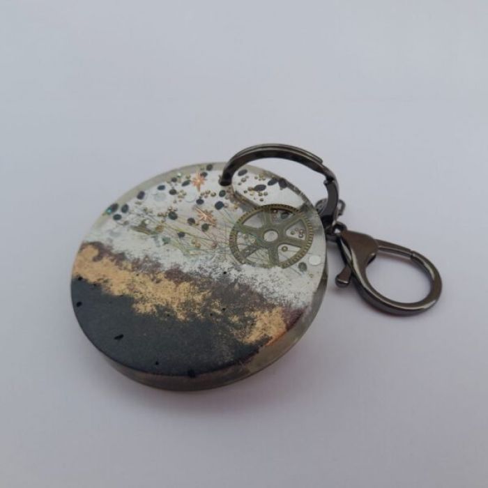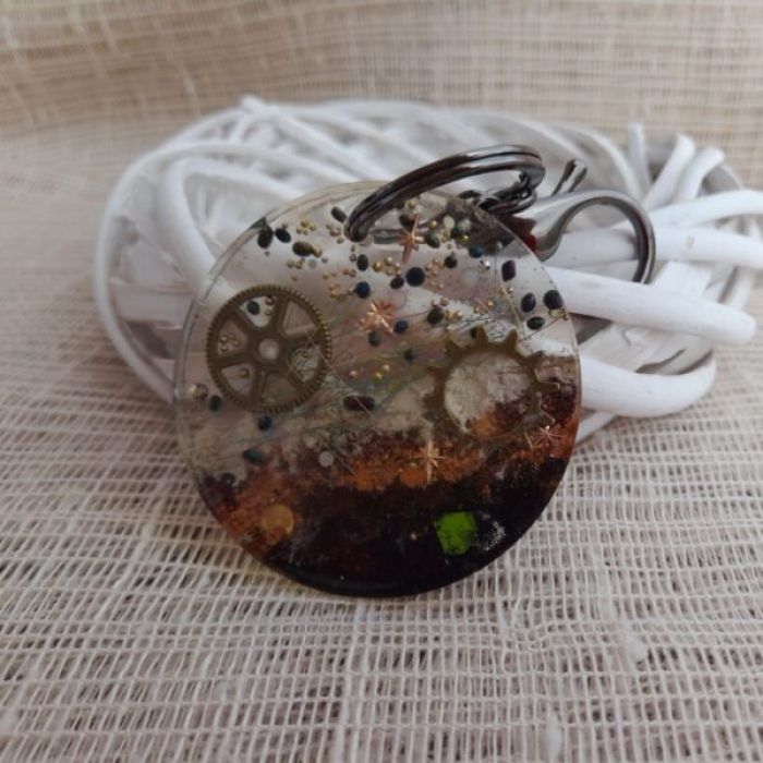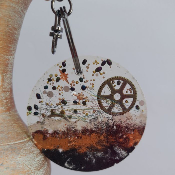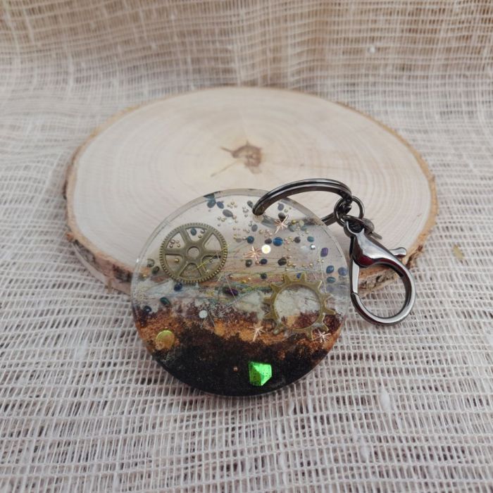 Okrągły brelok wykonany z przejrzystej żywicy, w której zatopiono drobne elementy ozdobne tworzące kosmiczną, abstrakcyjną kompozycję. W środku widoczny jest metalowy trybik przypominający fragment zegara, otoczony kolorowymi mikrokulkami, gwiazdkami i delikatnymi nitkami. Dolna część breloka utrzymana jest w ciepłych barwach brązu, czerni i bieli, dając efekt przypominający powierzchnię planety lub tajemniczego krajobrazu. Całość tworzy unikatowy, artystyczny dodatek idealny dla miłośników stylu steampunk, kosmosu i rękodzieła.
