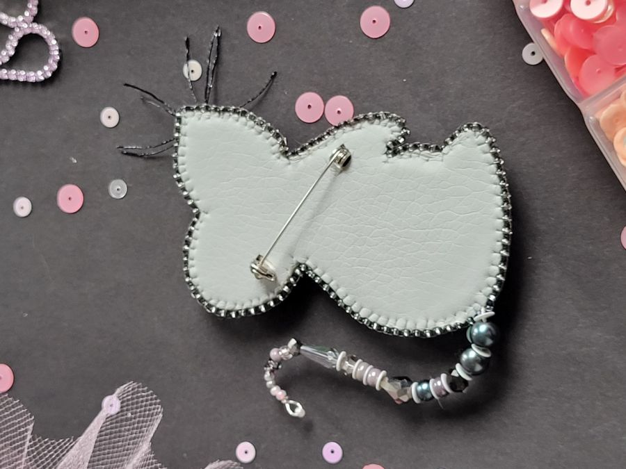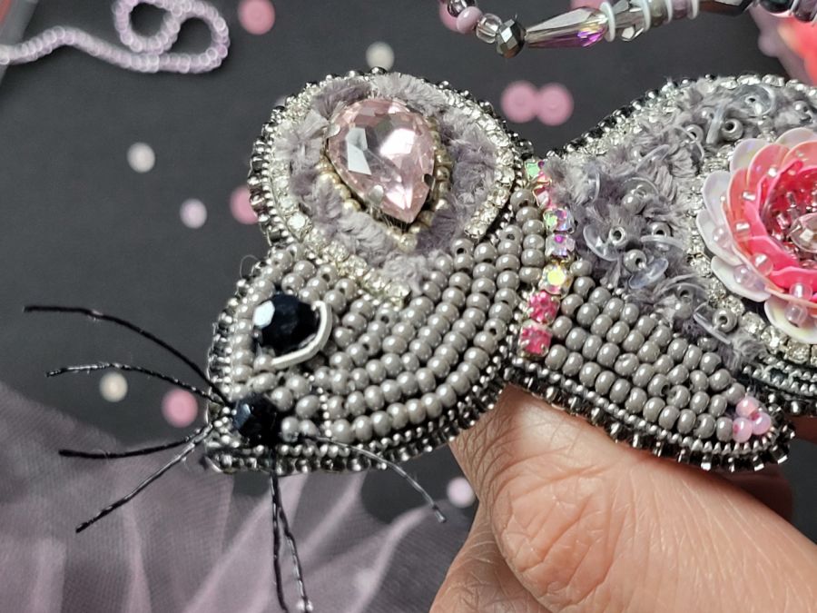 Zadaj pytanie dotyczące produktu: Broszka "Myszka ciemna z różą" haftowana cekinamy i koralikami