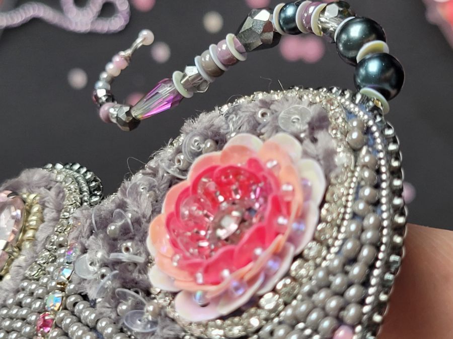 - Ręczne wykonanie z koralików, cekinów, kryształków, tkaniny i ozdobnych perełek.