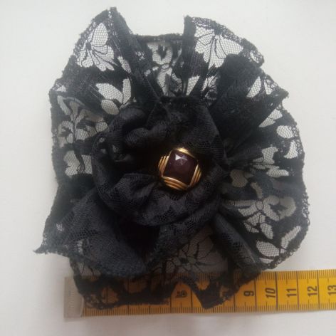 Broszka zrobiona z czarnej koronki ozdobiona guziczkiem.