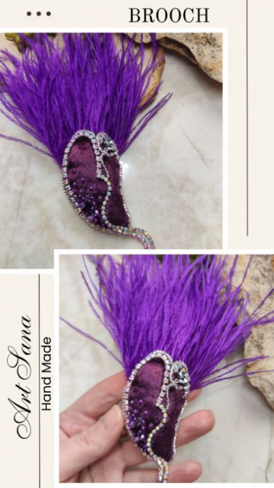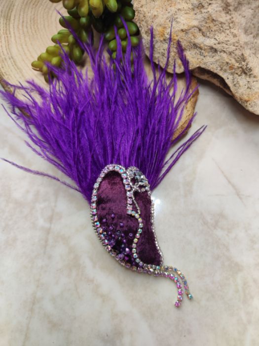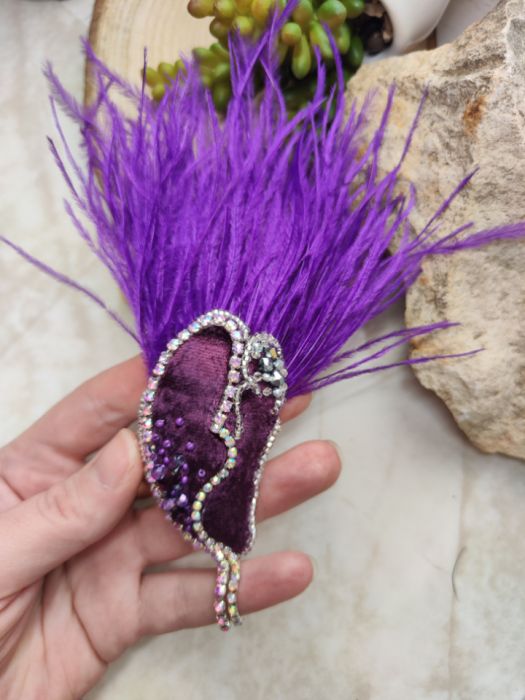 Stal, Tkanina, Akryl,Broszka została wykonana z miękkiego aksamitu i ozdobiona precyzyjnym haftem, czeskim koralikiem, kryształkami oraz lekkimi piórami, które nadają jej wyjątkowej lekkości i finezji. Tył broszki wykończony jest ekologiczną skórą, a solidne zapięcie gwarantuje wygodę i bezpieczeństwo noszenia.