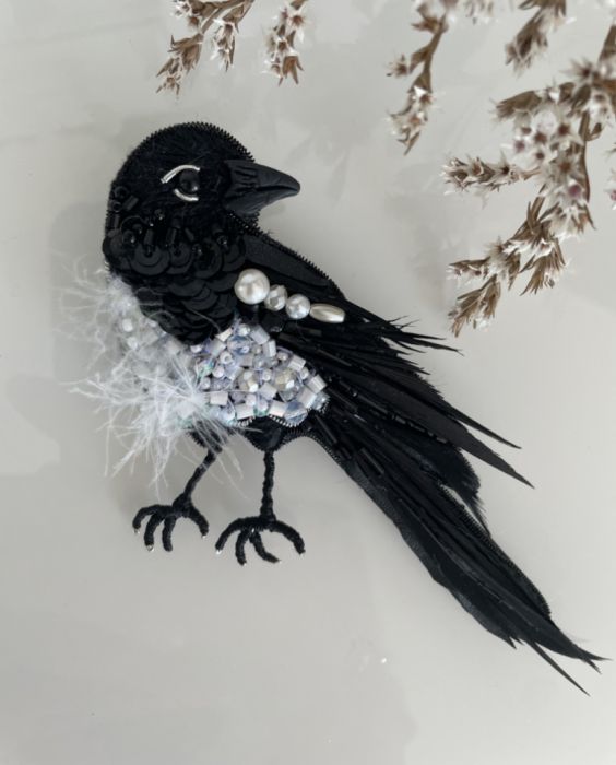 Sroka — ptak inteligentny, czujny i pełen charakteru. Z charakterystycznym czarno-białym upierzeniem i połyskiem kryształów przyciąga spojrzenia, stając się wyrazistym akcentem stylizacji. To ptak ciekawy świata, niezależny i pełen energii — tak jak ta wyjątkowa broszka.