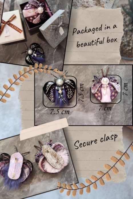 Stal, Tkanina, Akryl,Broszka została wykonana z miękkiego aksamitu i ozdobiona precyzyjnym haftem, czeskim koralikiem, kryształkami oraz lekkimi piórami, które nadają jej wyjątkowej lekkości i finezji. Tył broszki wykończony jest ekologiczną skórą, a solidne zapięcie gwarantuje wygodę i bezpieczeństwo noszenia.