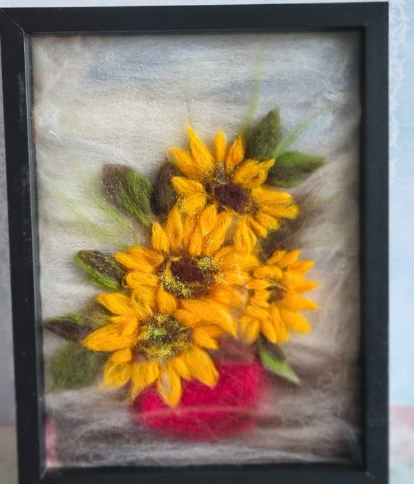 Niesamowita tekstura: Dzięki użyciu naturalnej wełny czesankowej, płatki słoneczników sprawiają wrażenie trójwymiarowych i miękkich. Obraz „żyje” w zależności od kąta padania światła.