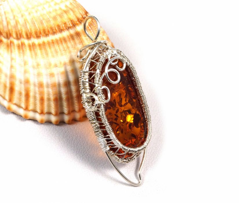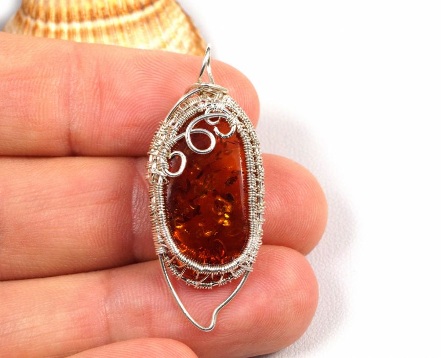 Bajeczny, misternie pleciony wisiorek z kaboszonem bursztynu bałtyckiego. Wisior zaprojektowany i wykonany przeze mnie od podstaw bardzo pracochłonną i precyzyjną techniką wire-wrapping ze srebra próby 925, 930 i 999.