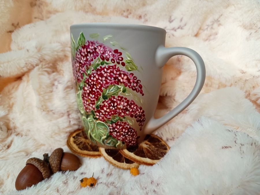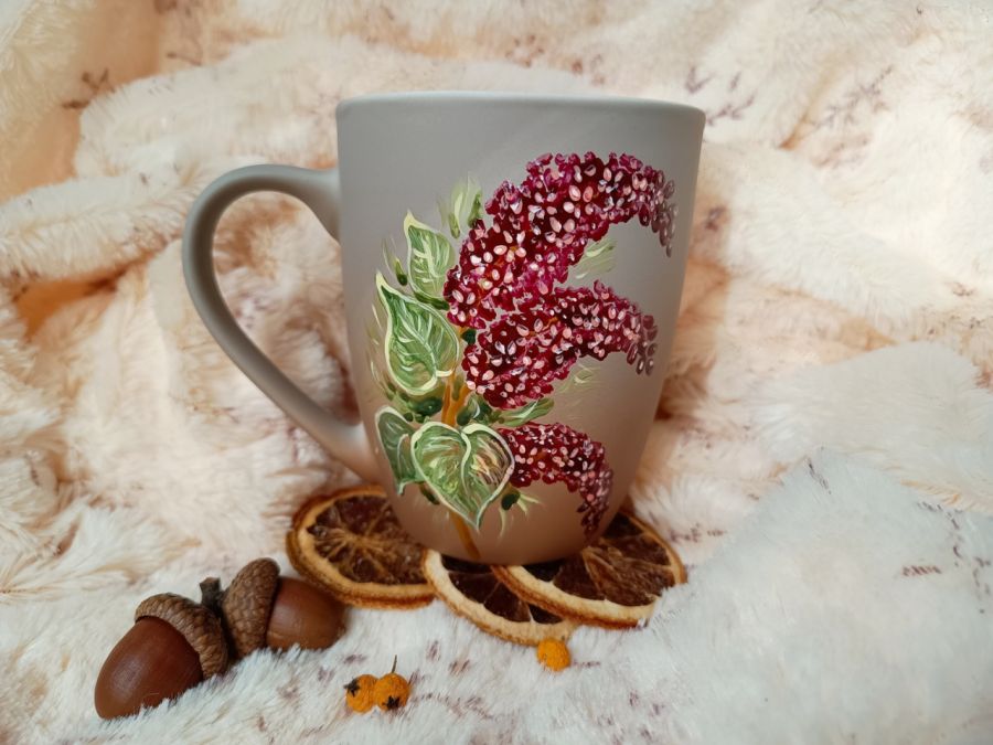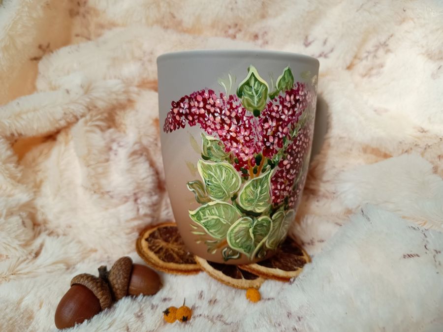 Ręcznie malowany kubek z kwitnącymi bzami.