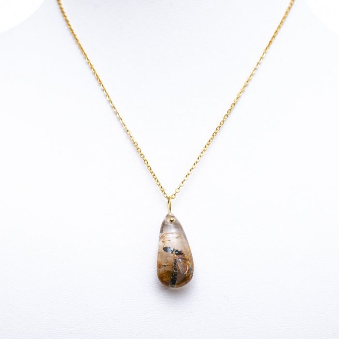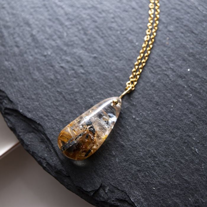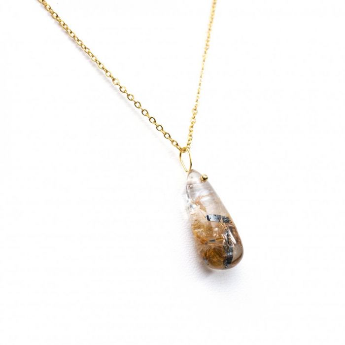 Ten wisiorek w kształcie kropli ukazuje naturalny kwarc rutylowany w jego najbardziej widowiskowej odsłonie. Jego krystaliczne wnętrze jest sceną dla intensywnych, miedziano-złotych nitek rutylu, które gęsto przeplatają się i zderzają z głębokimi, czarnymi inkluzjami. Ten rzadki kontrast tworzy dynamiczny i niemal trójwymiarowy efekt – to czysta, nieujarzmiona energia.