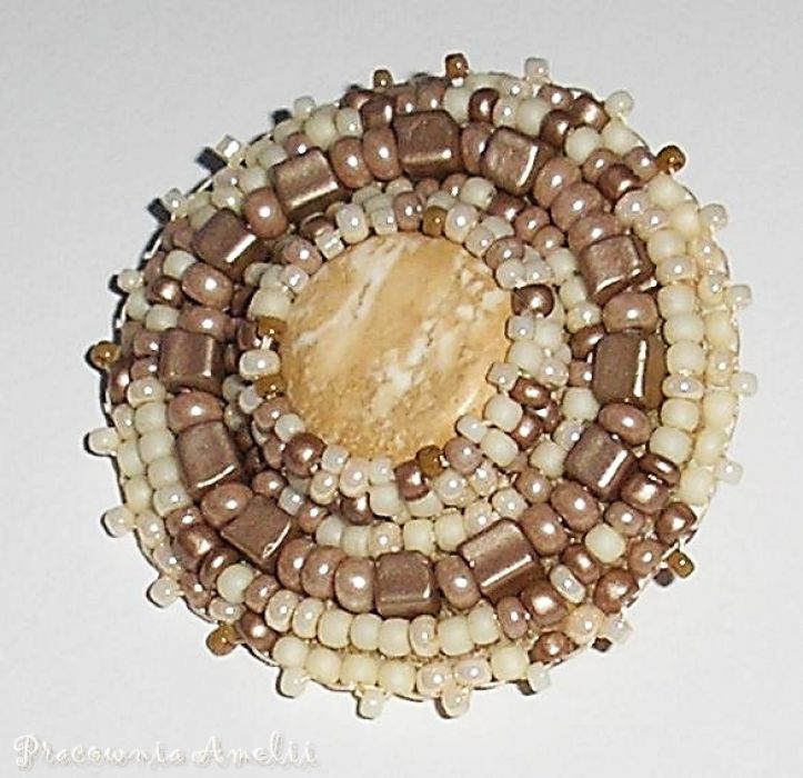 Niepowtarzalna broszka wykonana metodą haftu koralikowego od podstaw. Centralnym punktem jest pastylka howlitu opleciona japońskimi koralikami toho, czeskimi Preciosa i nieregularnymi kostkami w kolorze cappuccino. Tył podszyty kremową ekoskórką, zapięcie broszkowe z zabezpieczeniem.