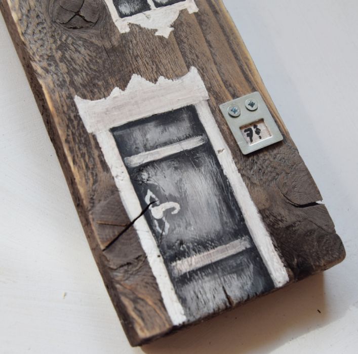 Obraz malowany farbami akrylowymi na starej desce, w której celowo zostawiłam niedoskonałości w postaci nierówności, otworów po gwozdziach aby zachować jej historię. W projekcie wykorzystane są również listewki z sosny/świerku oraz podkładki metalowe.