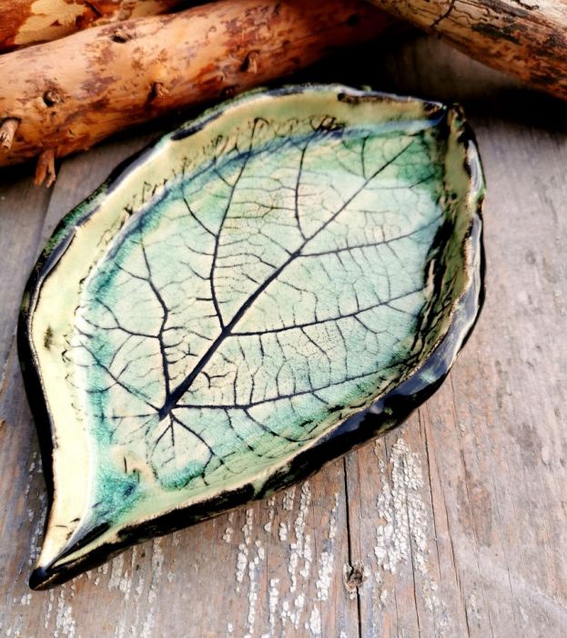 Ceramiczny listek wykonany z jasnej gliny, w którym odbity został prawdziwy liść. Pokryty szkliwami spożywczymi w kolorze delikatnego turkusu oraz czerni. Urocza gra kolorów oraz delikatne spękania. Idealnie sprawdzi się jako podstawka na biżuterię, przekąski, tealighta lub inne drobiazgi. Formowany ręcznie, dwukrotnie wypalany w piecu do ceramiki. Zostanie zapakowany dekoracyjnie i dobrze zabezpieczony na czas transportu.