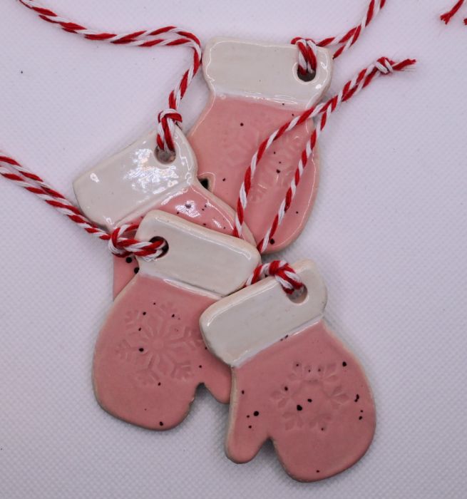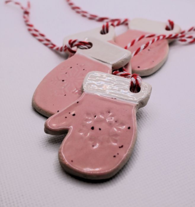 Ceramiczny pierniczek rękawiczka w kolorze różowym ozdobiony motywem świątecznym, ręcznie lepiony, pokryty szkliwem Mayco Stroke&Coat