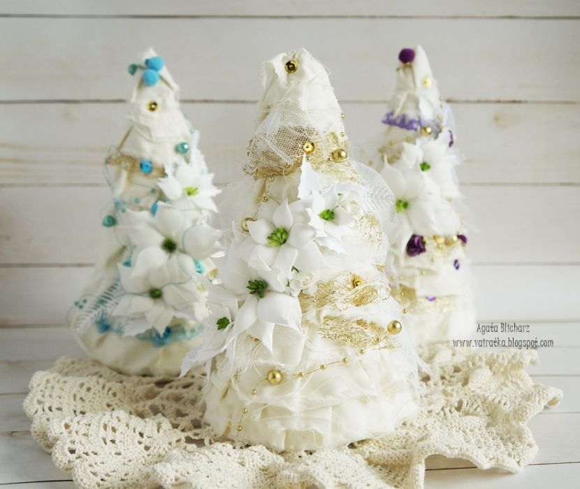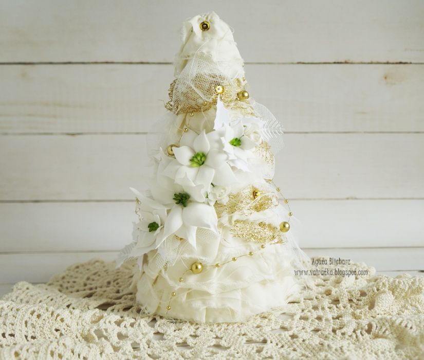 Wyjątkowa, delikatna, niezwykle ozdobna choinka wykonana (na bazie styropianowego stożka) z misternie upiętego materiału bawełnianego, tiulu, złotej koronki, ze złotymi dodatkami (róże na tiulu, cekiny, koraliki, pompony itp) oraz bogatą kompozycją kwiatową, złożoną z ręcznie wykonanych poinsecji z foamiranu, oraz "zimowych" listków - ostrokrzewu oraz jodły z białego papieru.