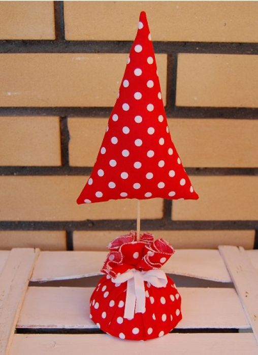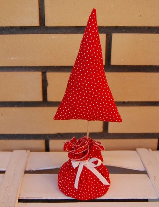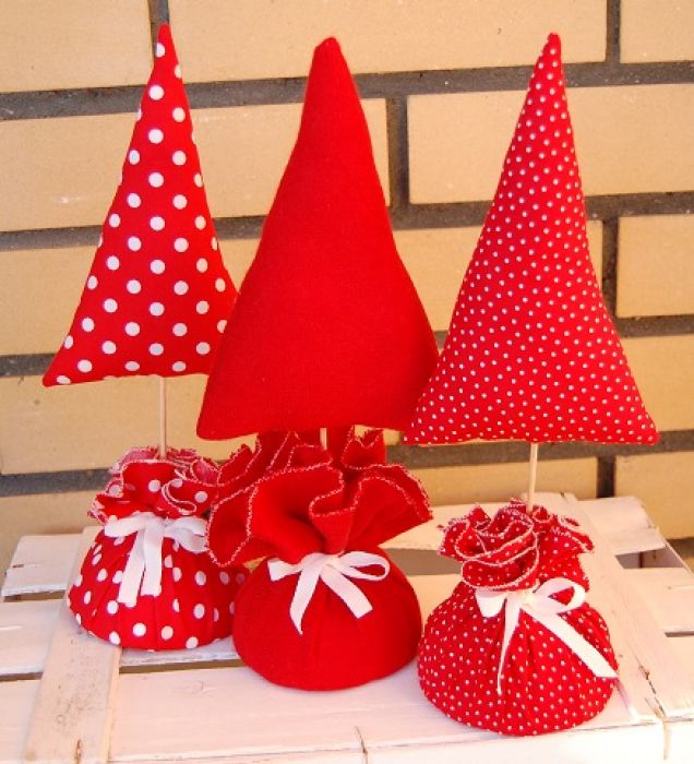 Choinki w "workach" - ozdoba świąteczna. Wykonane z różnych tkanin: czerwonej w białe groszki, czerwonej w białe kropki i czerwonej dzianiny swetrowej. Dół osadzony w "workach". W środku wypełnienie poduszkowe.