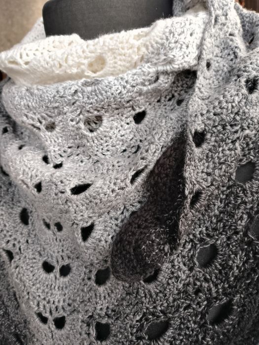 Chusta szydełkowa wykonana ręcznie pięknym wzorem z włóczki odpornej na mechacenie (akryl 50% bawełna 50%), bardzo przyjemnej w dotyku (nie gryzie). Uroku dodają jej ładne przejścia kolorystyczne od kremowej bieli poprzez jasno szary, szary, do czarnego, tworząc efekt ombre.