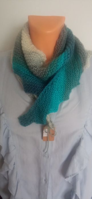 Kolorowa chusta strzałka wykonana na drutach z włóczki akrylowej i wełny merynosów