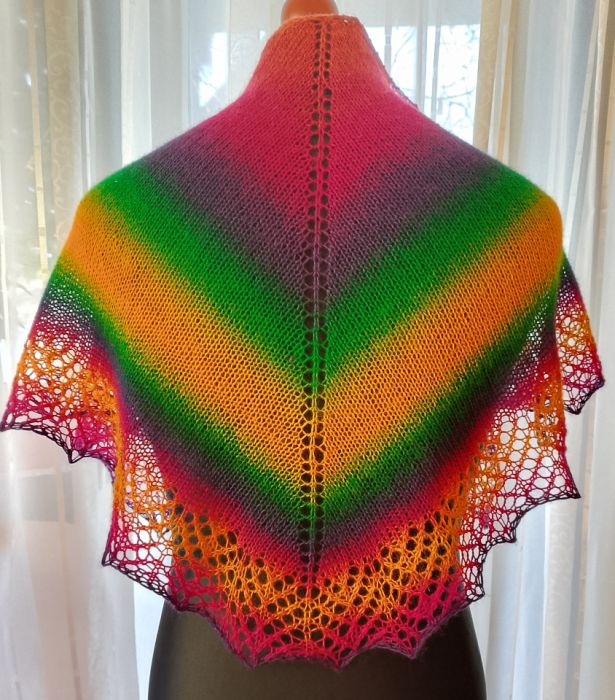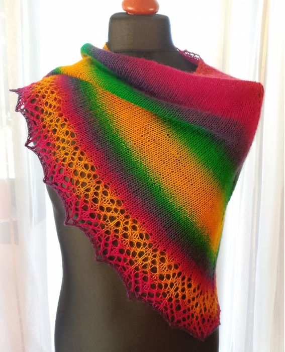 Przepiękna chusta wykonana w całości ręcznie na cienkich drutach, z cieniowanej w barwy tęczy delikatnej włóczki merino z dodatkiem moheru. Zakończona dekoracyjnym koronkowym brzegiem. Chusta jest miła w dotyku, leciutka a przy tym ciepła. Będzie wyjątkowym dodatkiem do każdej stylizacji. Została wykonana w kształcie półkola, dzięki czemu bardzo dobrze leży na ramionach. Jest unikatem, powstała wyłącznie w jednym egzemplarzu.