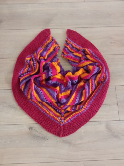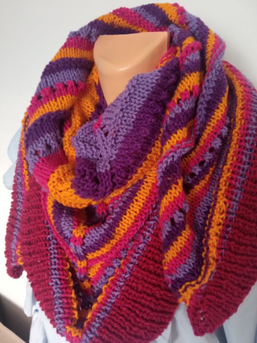 Kolorowa chusta wykonana na drutach z włóczki akrylowej, która nie uczula.