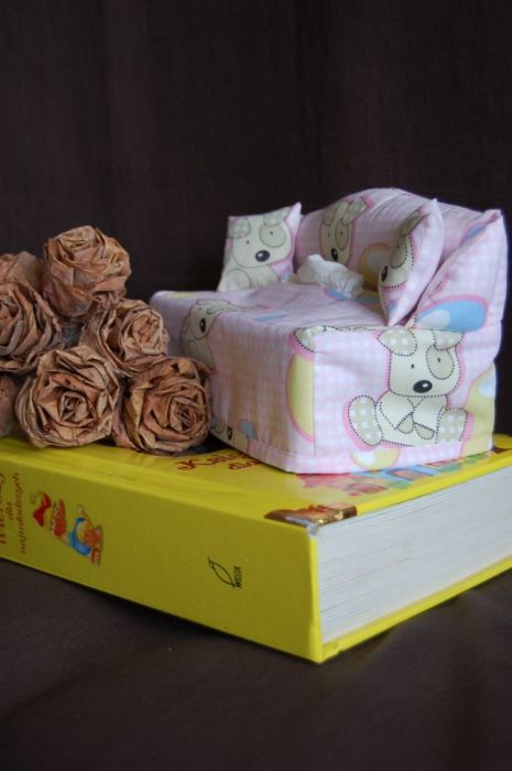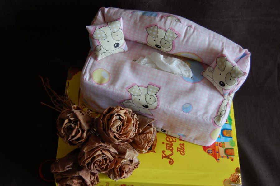 Chustecznik w formie kanapy, wykonany z bawełny w różową krateczkę z uroczymi pieskami, od spodu wykończony podszewką. Dodatkową ozdobą są miniaturowe poduszki - dwustronne, z jednej strony z psim motywem, z drugiej - różowa krateczka. Otwór na wyjmowanie chusteczek odszyty podszewką, więc nie ma mowy o strzępieniu się w trakcie "eksploatacji".