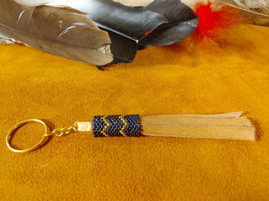 Jedyny w swoim rodzaju, wyjątkowy, ciekawy, wyjątkowy i, co najważniejsze, przyciągający wzrok. Takie właśnie cechy ma chwost w formie skórzanych frędzli, wykończony ozdobą z drobnych szklanych koralików w różnych kolorach. To mniejszy chwost wykonany z naturalnej, jasnobrązowej skóry. Górna część jest wydrążona błyszczącymi, granatowo-złotymi koralikami. Całość wykonana ręcznie. Długość całkowita: około 15 cm (wliczając złoty łańcuszek).