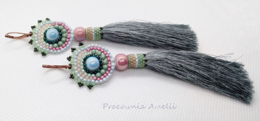Kolczyki z chwostami dopasowane kolorystycznie do bransoletki pastelowej z ceramiką. Wyplecione ręcznie od podstaw z drobnych koralików japońskich Toho z dodatkiem ceramicznych kulek w kolorze pudrowego różu i błękitu, oraz szklanych czeskich zielonych kuleczek. Bigle angielskie.